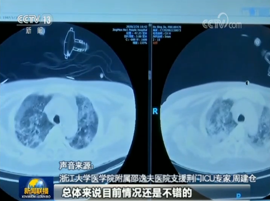 聲音來源:浙江大學(xué)醫(yī)學(xué)院附屬邵逸夫醫(yī)院支援荊門ICU專家 周建倉(cāng):左邊是26號(hào)的,右邊是23號(hào)的,肺部吸收還是比較明顯,總體來說目前情況還不錯(cuò)。