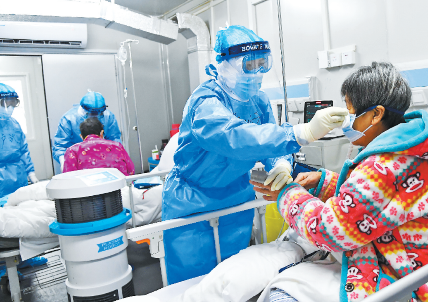2月28日,火神山醫院醫務人員看望即將出院的患者時,患者流下了感激的眼淚。圖為醫務人員為患者擦拭眼淚。解放軍報記者王傳順 攝