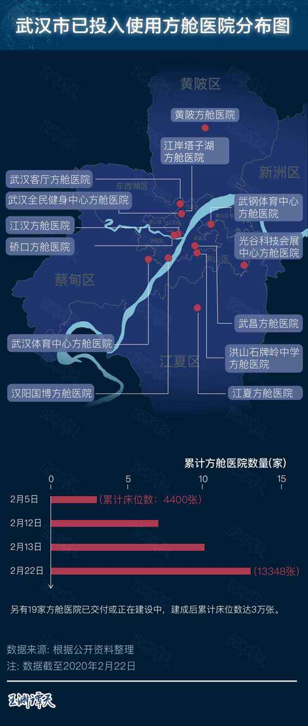 曾經,床位是制約“應收盡收”的最大障礙。在1月23日之前,武漢僅有2家新冠肺炎定點醫院,新建火神山、雷神山醫院,再加上不斷擴增,現在定點醫院有48家。