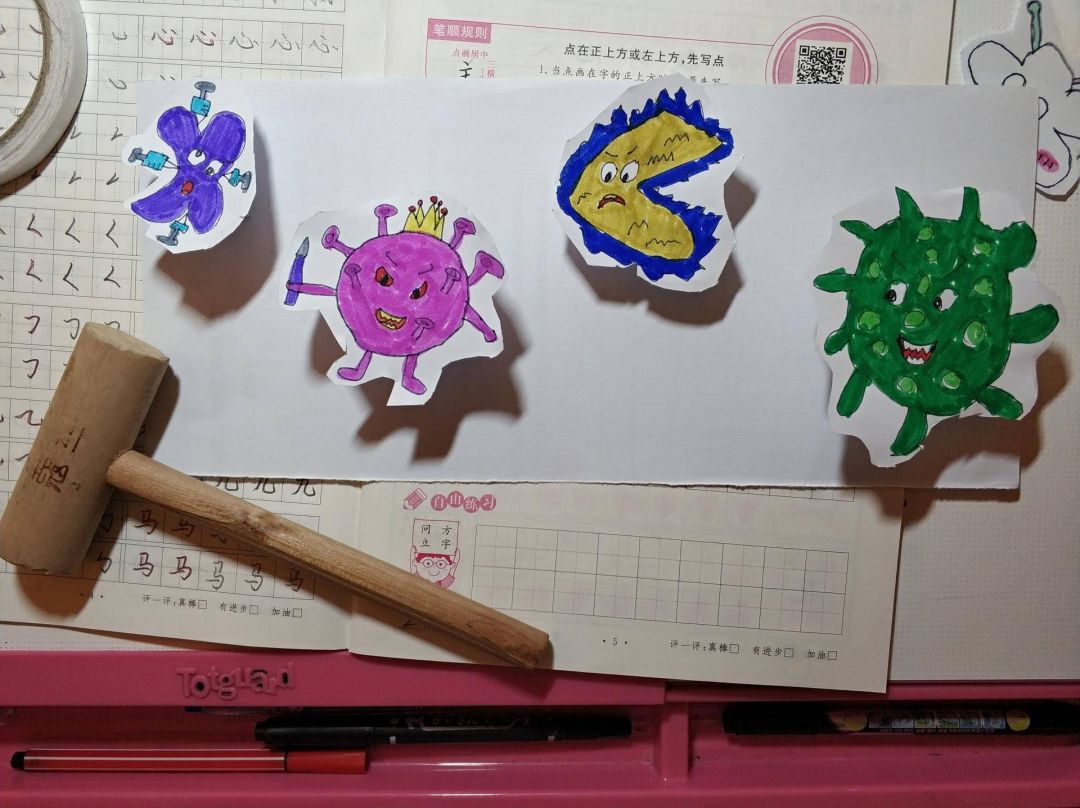 這是我女兒畫的,病毒下面粘了彈簧,病毒一出來,她就用錘子使勁兒捶。