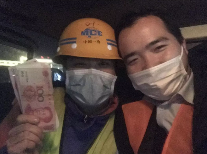 這張是在雷神山工地的一位大叔,拿到工資挺高興的,他說他要立馬轉(zhuǎn)回去給家里,讓家人去買菜。