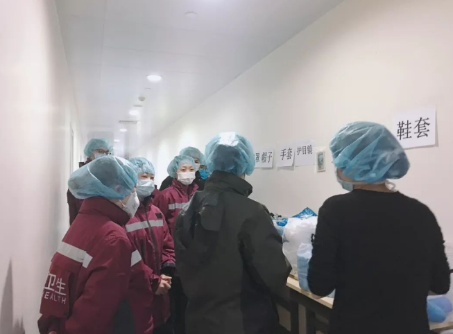到了武漢大學人民醫(yī)院,我們在清潔區(qū)的通道里換防護服,洗手衣+防護服+隔離衣+自己的衣服,一共四層。再戴上兩個口罩和一個護目鏡。