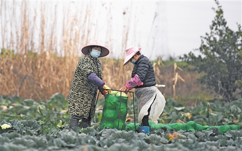 2月26日,湖北黃岡市黃州區路口鎮夾洲村,豐實蔬菜種植專業合作社的社員正在收蔬菜。本報記者 高興貴攝