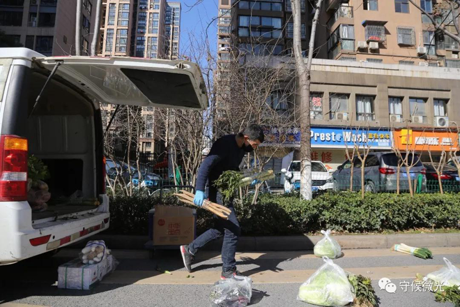 2月16日,湖北省武漢市,送菜小哥許可在為取單的小區居民擺放貨品。中國青年報 趙迪/攝