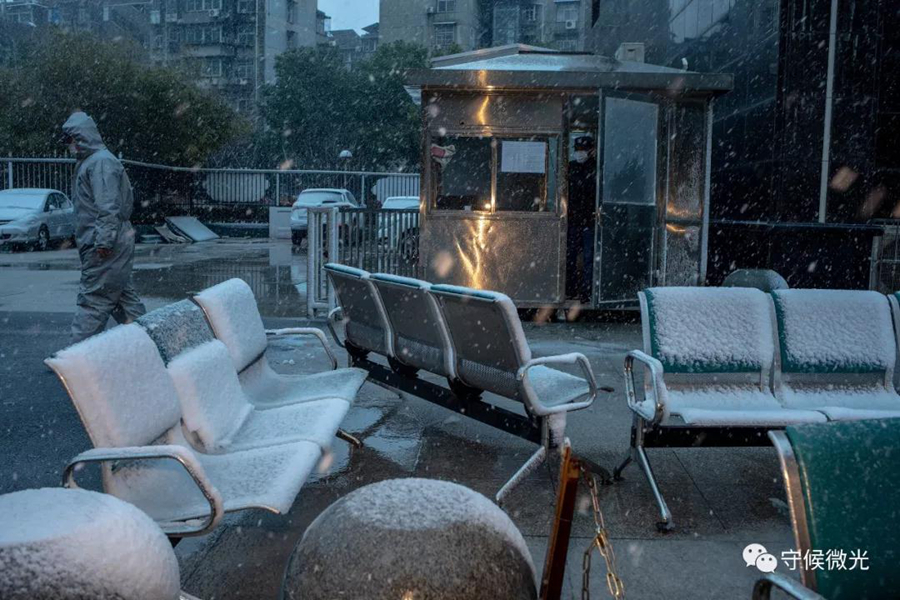 2月15日,湖北省武漢市武昌區,湖北大中中醫院門前,一名工作人員經過。椅子上已經落了厚厚一層雪。中國青年報 李雋輝/攝