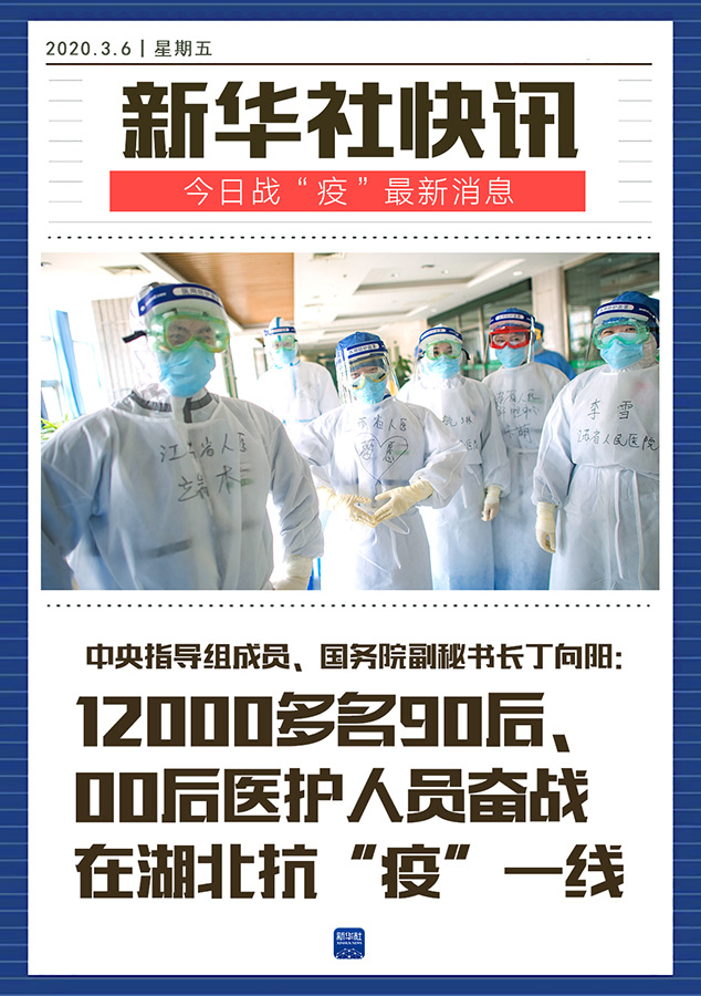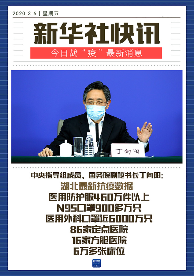 國(guó)務(wù)院新聞辦公室3月6日在湖北武漢舉行新聞發(fā)布會(huì),請(qǐng)中央指導(dǎo)組成員、國(guó)務(wù)院副秘書長(zhǎng)丁向陽(yáng),中央指導(dǎo)組成員、工業(yè)和信息化部副部長(zhǎng)王江平,中央指導(dǎo)組成員、國(guó)家衛(wèi)生健康委黨組成員、中醫(yī)藥局黨組書記余艷紅介紹新冠肺炎疫情防控救治進(jìn)展情況,并答記者問(wèn)。