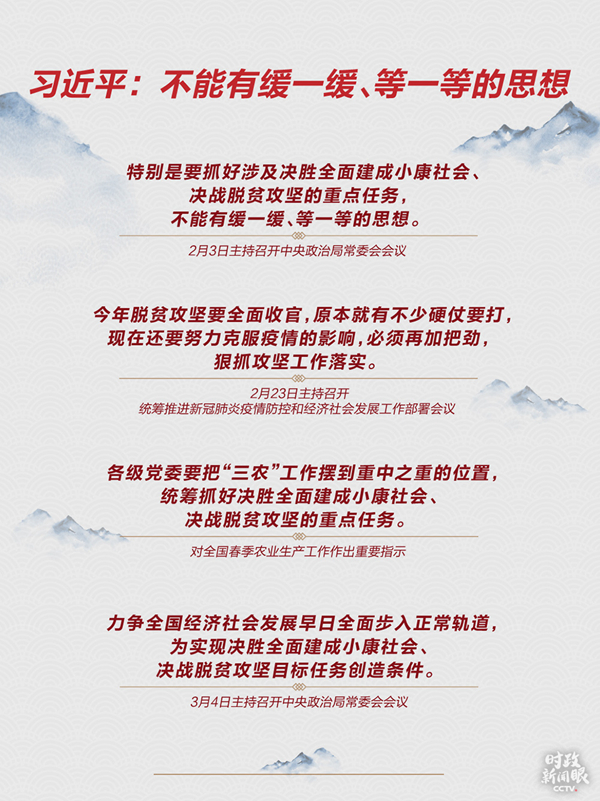 去年3月7日,習(xí)近平在甘肅代表團(tuán)專(zhuān)門(mén)談脫貧攻堅(jiān),“不獲全勝、決不收兵!”今年3月6日,距離收官已不足10個(gè)月,決戰(zhàn)決勝脫貧攻堅(jiān)座談會(huì)在北京召開(kāi)。習(xí)近平在會(huì)上說(shuō),“到2020年現(xiàn)行標(biāo)準(zhǔn)下的農(nóng)村貧困人口全部脫貧,是黨中央向全國(guó)人民作出的鄭重承諾,必須如期實(shí)現(xiàn),沒(méi)有任何退路和彈性”。