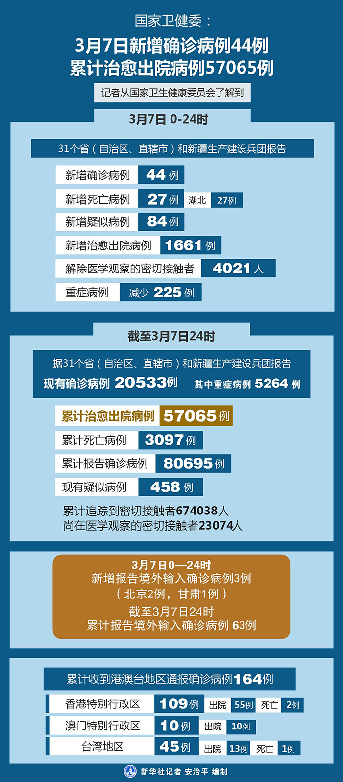 截至3月7日24時(shí),據(jù)31個(gè)省(自治區(qū)、直轄市)和新疆生產(chǎn)建設(shè)兵團(tuán)報(bào)告,現(xiàn)有確診病例20533例(其中重癥病例5264例),累計(jì)治愈出院病例57065例,累計(jì)死亡病例3097例,累計(jì)報(bào)告確診病例80695例,現(xiàn)有疑似病例458例。累計(jì)追蹤到密切接觸者674038人,尚在醫(yī)學(xué)觀察的密切接觸者23074人。