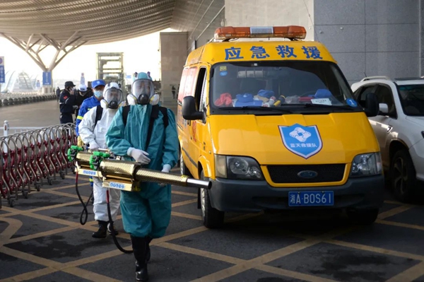 2月5日,長沙藍(lán)天救援隊隊員準(zhǔn)備進(jìn)入長沙磁浮高鐵站消毒殺菌。新華社發(fā)(陳振海攝)