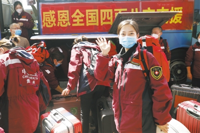 3月17日,支援湖北的部分貴州醫療隊員和湖南醫療隊員從武漢火車站乘坐高鐵離開。圖為貴州醫療隊員向歡送的人們揮手致意。新華社記者 沈伯韓攝