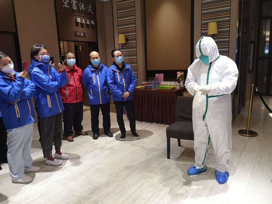 圖為四川大學華西醫院援湖北醫療隊朱仕超(右二)與同事相互鼓勵打氣。