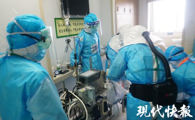 現(xiàn)代快報(bào)記者穿好防護(hù)服,與醫(yī)護(hù)人員一同進(jìn)入重癥病房。