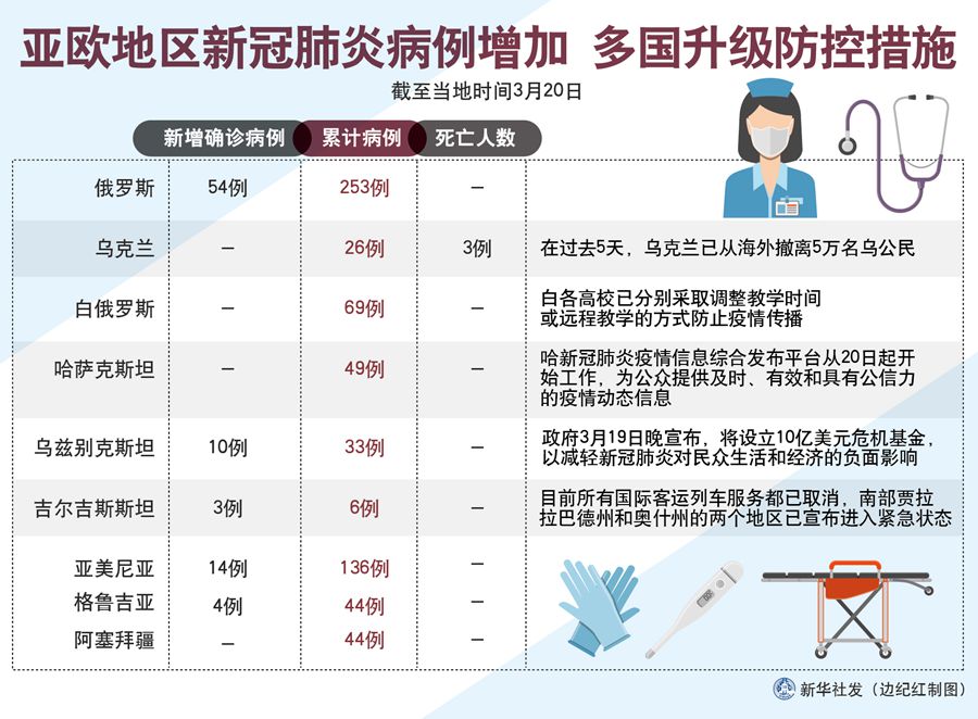 新華社莫斯科3月21日電 綜合新華社駐亞歐地區(qū)記者報道:亞歐地區(qū)新冠肺炎確診病例20日繼續(xù)增加,多國采取暫停客運(yùn)等防控措施。