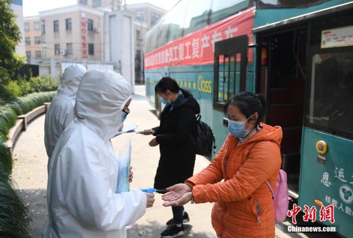 3月19日,湖北恩施復(fù)工人員到達杭州洲際食品有限公司后進行防疫消毒。當(dāng)日,來自湖北省恩施州的首批146名赴杭州復(fù)工人員抵達浙江杭州。 中新社記者 王剛 攝
