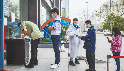 3月22日,在洪山區(qū)中百倉儲光谷購物廣場,記者看到超市已經(jīng)恢復正常營業(yè)。為保障顧客健康安全,超市采取了出示綠色健康碼或社區(qū)健康證明、測量體溫、每日限流等舉措。據(jù)悉,3月20日,武漢市商務局通報,根據(jù)武漢市疫情防控指揮部有關工作組決定,自即日起,無疫情小區(qū)和社區(qū)將有限放行,商業(yè)設施和商業(yè)網(wǎng)點將逐步有序開放。圖一:顧客正在將蔬菜等商品過秤;圖二:進入超市前,顧客正在排隊登記個人信息并檢測體溫。(記者 張武軍攝)
