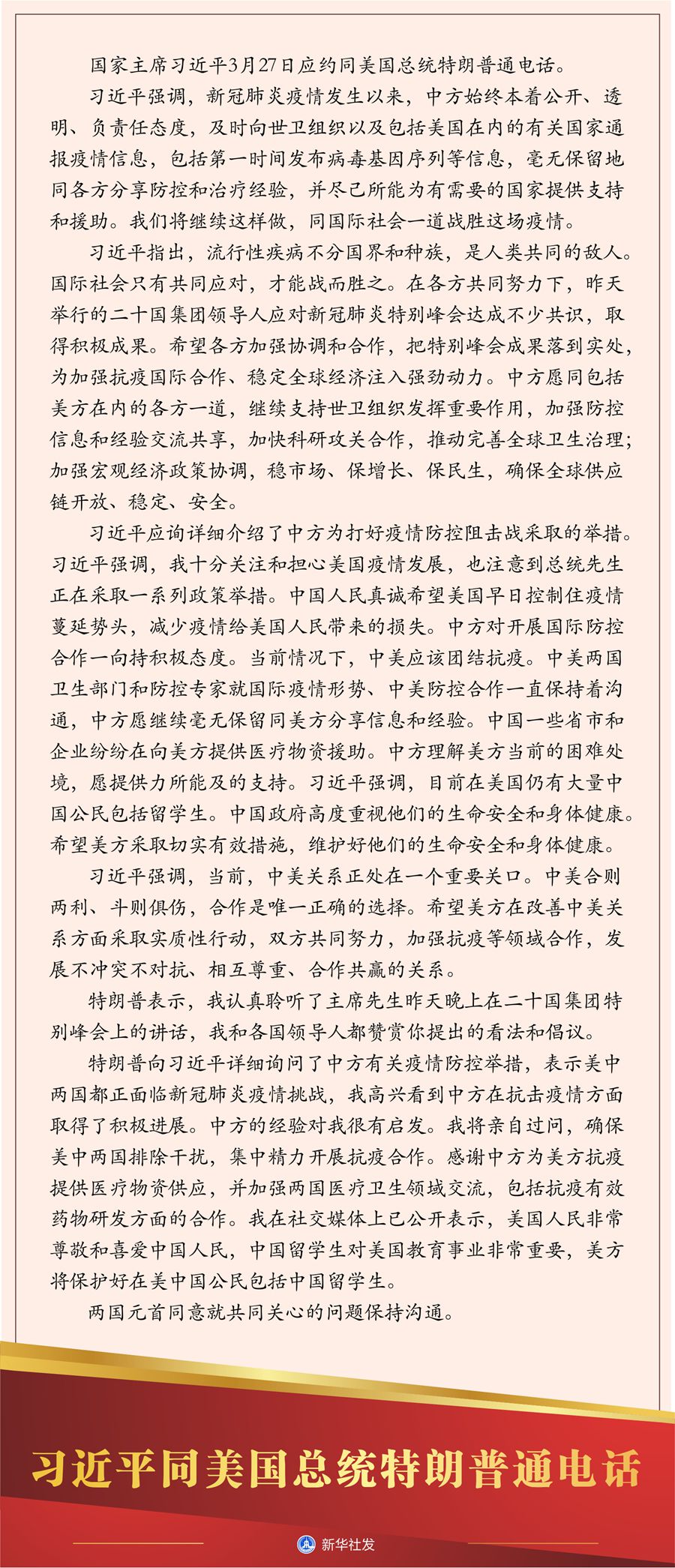 習(xí)近平應(yīng)詢詳細(xì)介紹了中方為打好疫情防控阻擊戰(zhàn)采取的舉措。習(xí)近平強(qiáng)調(diào),我十分關(guān)注和擔(dān)心美國疫情發(fā)展,也注意到總統(tǒng)先生正在采取一系列政策舉措。中國人民真誠希望美國早日控制住疫情蔓延勢頭,減少疫情給美國人民帶來的損失。中方對開展國際防控合作一向持積極態(tài)度。當(dāng)前情況下,中美應(yīng)該團(tuán)結(jié)抗疫。中美兩國衛(wèi)生部門和防控專家就國際疫情形勢、中美防控合作一直保持著溝通,中方愿繼續(xù)毫無保留同美方分享信息和經(jīng)驗(yàn)。中國一些省市和企業(yè)紛紛在向美方提供醫(yī)療物資援助。中方理解美方當(dāng)前的困難處境,愿提供力所能及的支持。習(xí)近平強(qiáng)調(diào),目前在美國仍有大量中國公民包括留學(xué)生。中國政府高度重視他們的生命安全和身體健康。希望美方采取切實(shí)有效措施,維護(hù)好他們的生命安全和身體健康。