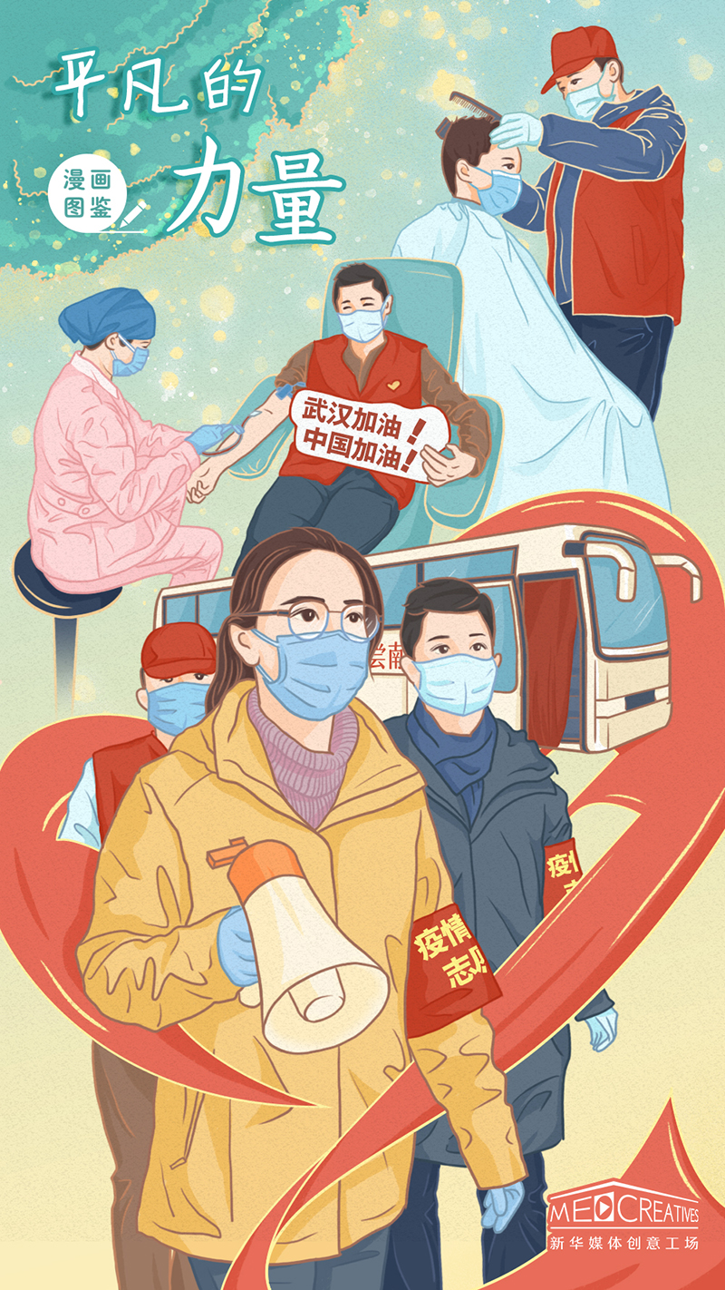 免費為醫護人員烹飪盒飯的“雨衣妹妹”劉仙、有求必應的湯紅秋及美德志愿者聯盟……一個個俠肝義膽的故事廣為流傳,一位位無私奉獻的凡人成為網紅。無數力量匯集、無數暖流涌動,穿過厚重的隔離、封閉的圍欄,為這座城市驅走黑暗、帶來希望。