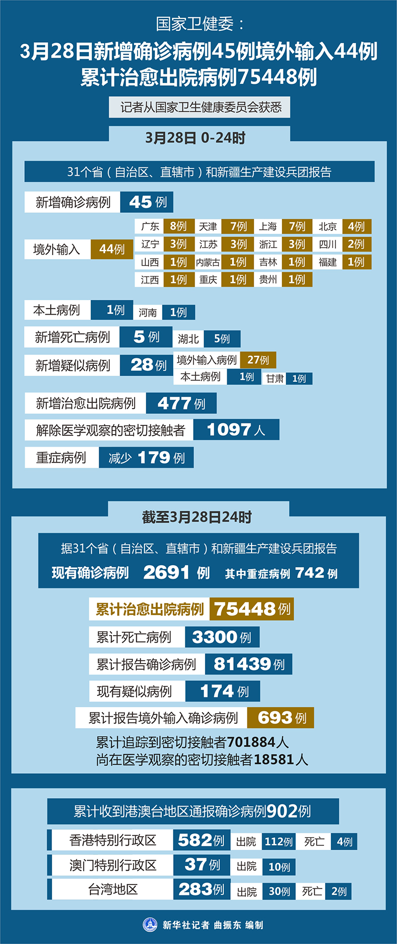 截至3月28日24時,據(jù)31個省(自治區(qū)、直轄市)和新疆生產(chǎn)建設(shè)兵團報告,現(xiàn)有確診病例2691例(其中重癥病例742例),累計治愈出院病例75448例,累計死亡病例3300例,累計報告確診病例81439例,現(xiàn)有疑似病例174例。累計追蹤到密切接觸者701884人,尚在醫(yī)學(xué)觀察的密切接觸者18581人。