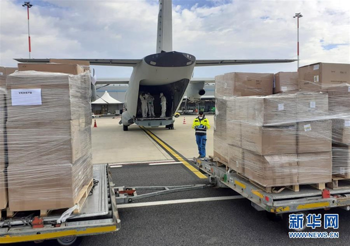這是在意大利羅馬的菲烏米奇諾機場拍攝的從飛機上卸下的醫(yī)療物資(3月30日攝)。新華社發(fā)
