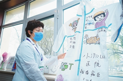 醫護人員展示防護服上的涂鴉作品。為減輕待篩查人員緊張心理,幫助確診患者樹立戰勝疾病的信心,醫院在籌建之初,就將心理干預納入其中,發起組織病區環境布置、背包設計、折紙比賽、八段錦訓練等活動,營造“家”的氛圍。記者 賀 勇攝