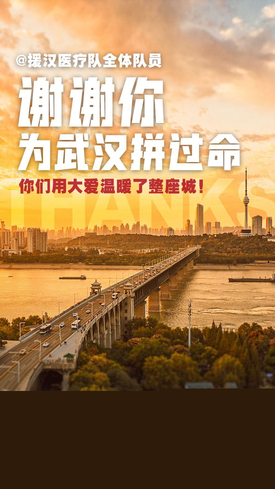 新冠肺炎疫情突如其來,武漢疫情牽動著全國人民的心,武漢成為疫情防控斗爭的重中之重和決勝之地。在以習近平同志為核心的黨中央堅強領(lǐng)導下,人民解放軍、全國各地鼎力相助、火線馳援。兩個多月來,你們毅然告別家人,白衣執(zhí)甲、逆行出征,日夜奮戰(zhàn)在看不見硝煙的戰(zhàn)場上,同時間賽跑、與病魔較量,涌現(xiàn)出一大批可歌可泣的先進典型和感人事跡,為打贏武漢保衛(wèi)戰(zhàn)發(fā)揮了中堅力量的作用,展現(xiàn)了醫(yī)者仁心的崇高精神,展現(xiàn)了新時代醫(yī)務(wù)工作者的良好形象,感動了武漢,感動了中國,感動了世界!在此,中共武漢市委、武漢市人民政府和一千多萬武漢市民,向你們致以最崇高的敬意和最誠摯的感謝!