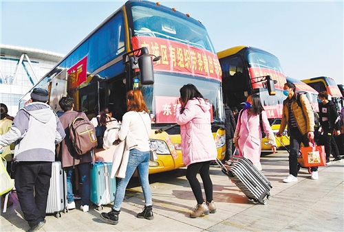 河南省南陽市宛城區(qū)組織務工人員乘坐大巴返崗。 陳 瓊攝