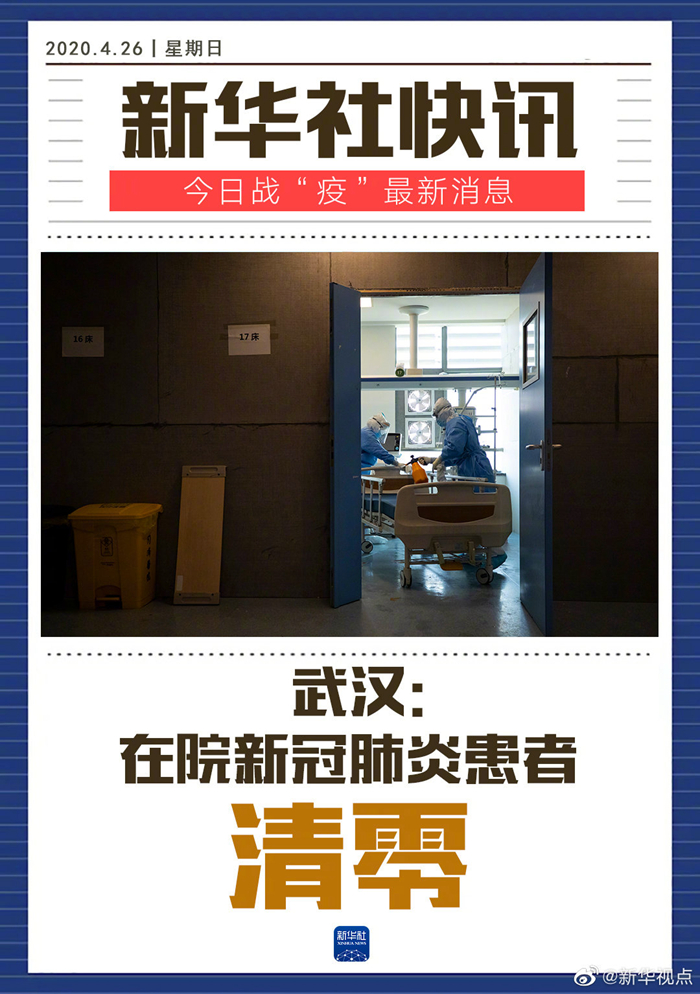 國家衛健委新聞發言人米鋒26日在國務院聯防聯控機制新聞發布會上說,至26日,武漢在院新冠肺炎患者清零。