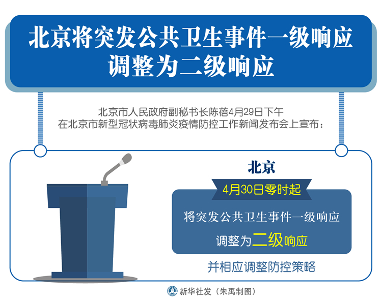 新華社北京4月29日電(記者關(guān)桂峰)北京市人民政府副秘書長陳蓓29日下午在北京市新型冠狀病毒肺炎疫情防控工作新聞發(fā)布會上宣布:4月30日零時(shí)起,北京將突發(fā)公共衛(wèi)生事件一級響應(yīng)調(diào)整為二級響應(yīng),并相應(yīng)調(diào)整防控策略。