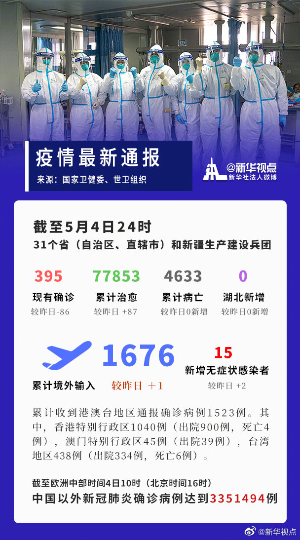 截至5月4日24時(shí),據(jù)31個(gè)省(自治區(qū)、直轄市)和新疆生產(chǎn)建設(shè)兵團(tuán)報(bào)告,現(xiàn)有確診病例395例(其中重癥病例29例),累計(jì)治愈出院病例77853例,累計(jì)死亡病例4633例,累計(jì)報(bào)告確診病例82881例,現(xiàn)有疑似病例2例。累計(jì)追蹤到密切接觸者735240人,尚在醫(yī)學(xué)觀察的密切接觸者7152人。
