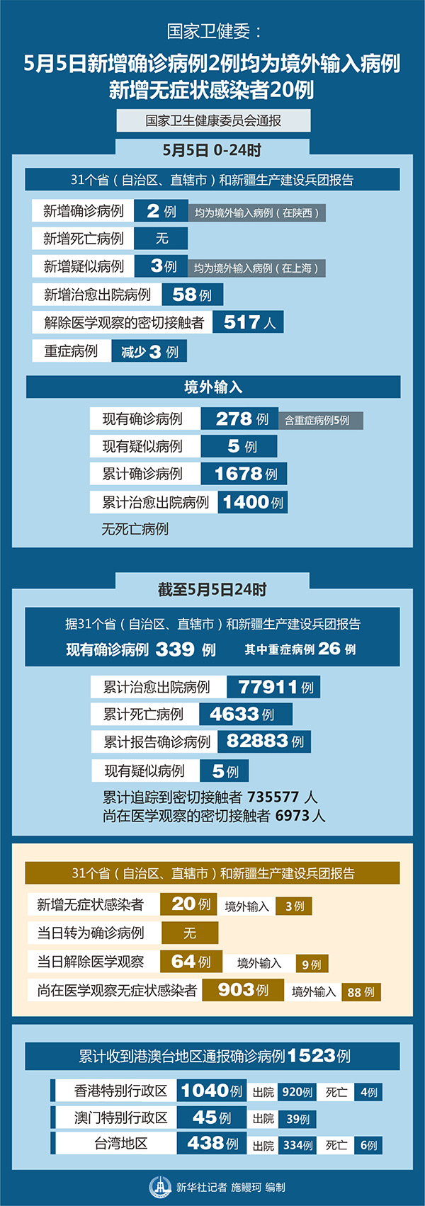 截至5月5日24時,據31個省(自治區、直轄市)和新疆生產建設兵團報告,現有確診病例339例(其中重癥病例26例),累計治愈出院病例77911例,累計死亡病例4633例,累計報告確診病例82883例,現有疑似病例5例。累計追蹤到密切接觸者735577人,尚在醫學觀察的密切接觸者6973人。