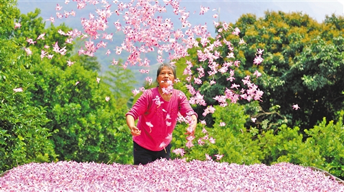 5月5日,在貴州省赤水市長(zhǎng)沙鎮(zhèn)長(zhǎng)興村,農(nóng)戶(hù)在晾曬剛采摘的金釵石斛鮮花。近年來(lái),赤水市積極推進(jìn)生態(tài)農(nóng)業(yè)與鄉(xiāng)村旅游產(chǎn)業(yè)融合發(fā)展,引導(dǎo)農(nóng)民在丹霞石上種植金釵石斛9萬(wàn)余畝,助力脫貧攻堅(jiān)和鄉(xiāng)村振興。王長(zhǎng)育攝(中經(jīng)視覺(jué))