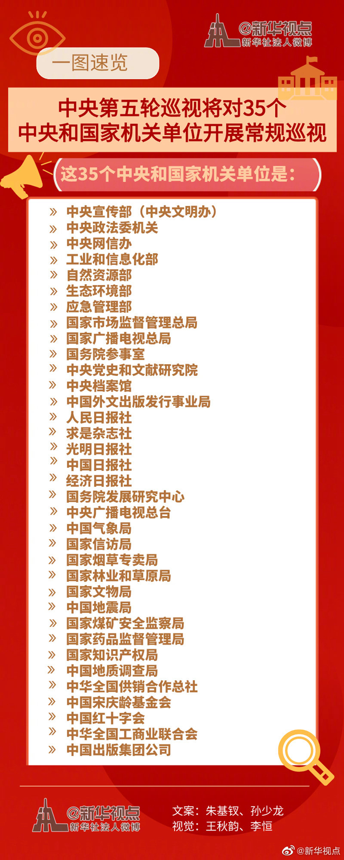 新華社北京5月9日電 經(jīng)黨中央批準(zhǔn),十九屆中央第五輪巡視將對中央宣傳部(中央文明辦)、中央政法委機關(guān)、中央網(wǎng)信辦、工業(yè)和信息化部、自然資源部、生態(tài)環(huán)境部、應(yīng)急管理部、國家市場監(jiān)督管理總局、國家廣播電視總局、國務(wù)院參事室、中央黨史和文獻研究院、中央檔案館、中國外文出版發(fā)行事業(yè)局、人民日報社、求是雜志社、光明日報社、中國日報社、經(jīng)濟日報社、國務(wù)院發(fā)展研究中心、中央廣播電視總臺、中國氣象局、國家信訪局、國家煙草專賣局、國家林業(yè)和草原局、國家文物局、中國地震局、國家煤礦安全監(jiān)察局、國家藥品監(jiān)督管理局、國家知識產(chǎn)權(quán)局、中國地質(zhì)調(diào)查局、中華全國供銷合作總社、中國宋慶齡基金會、中國紅十字會、中華全國工商業(yè)聯(lián)合會、中國出版集團公司等35個中央和國家機關(guān)單位黨組織開展常規(guī)巡視。