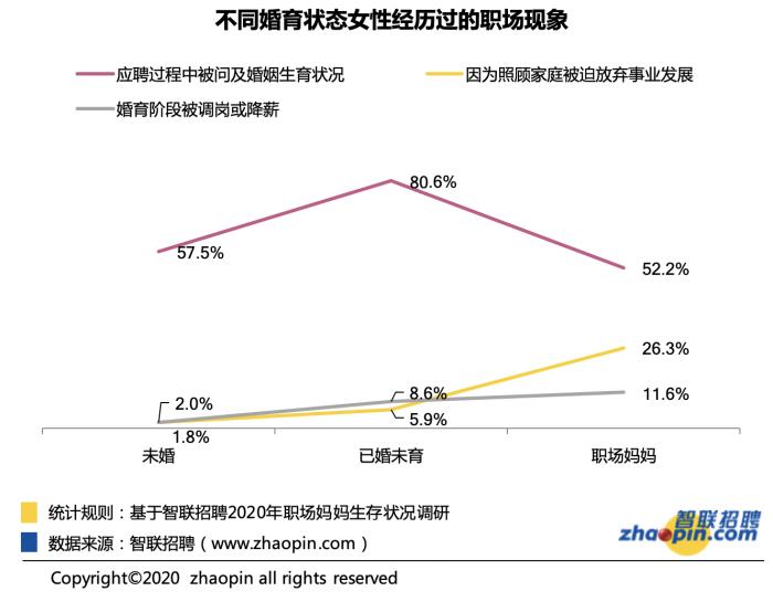 不同婚育狀態女性經歷過的職場現象。圖片來源:《2020年職場媽媽生存狀況調查報告》