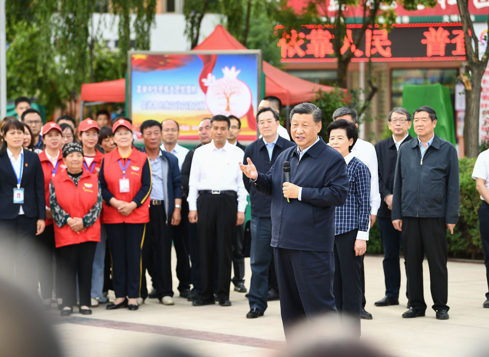 (2020年6月8日下午,習近平在吳忠市利通區金花園社區廣場,同居民們親切交流。新華社記者燕雁攝)