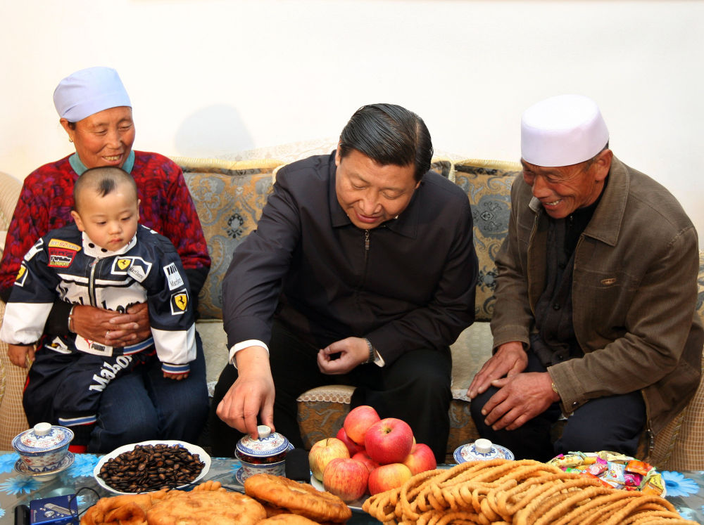 (2008年4月8日,習近平在固原市原州區開城鎮深溝村考察新農村建設情況時看望回族農民金學文一家,并在農民家品嘗當地的蓋碗茶。新華社記者蘭紅光攝)