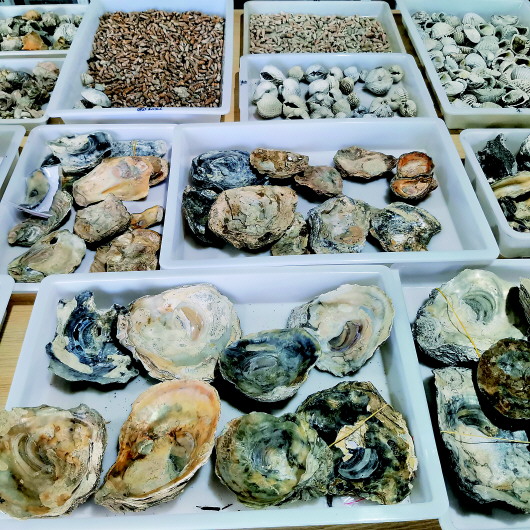 在這樣的環(huán)境下,先民們顯然先得靠海吃海。在基坑里,記者看到土層里夾雜著一層層的貝殼。在考古工地工作用房門外的走廊上,一排排裝滿各類貝殼的塑料箱摞了兩三層高。而在兩大間庫房里,各種海生貝類的貝殼擺了“好幾桌”,特別是那些巨大的牡蠣殼,大的足足有餐桌上的菜盆子那么大,由此想象一下,足以讓現(xiàn)代的老饕們垂涎三尺。