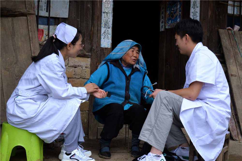6月16日,在云南省曲靖市羅平縣老廠鄉法乃村,來自老廠鄉衛生院的護士李文瑞(左)和醫生敖瑞遠(右)與村民歐美益交談,了解她的健康狀況。新華社記者 劉昕宇 攝