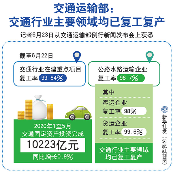 新華社北京6月23日電(魏玉坤、李麗華)記者23日從交通運(yùn)輸部例行新聞發(fā)布會(huì)上獲悉,截至6月22日,交通行業(yè)在建重點(diǎn)項(xiàng)目復(fù)工率達(dá)到99.84%,公路水路運(yùn)輸企業(yè)復(fù)工率達(dá)到98.7%,其中客運(yùn)和貨運(yùn)企業(yè)復(fù)工率分別達(dá)到98%、99.6%,交通行業(yè)主要領(lǐng)域均已復(fù)工復(fù)產(chǎn)。