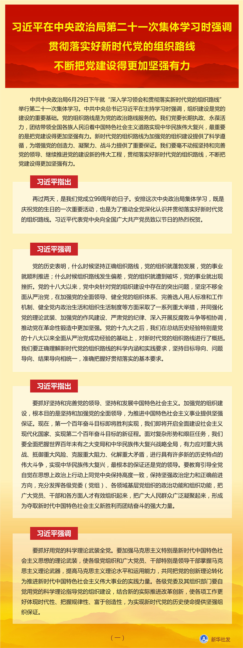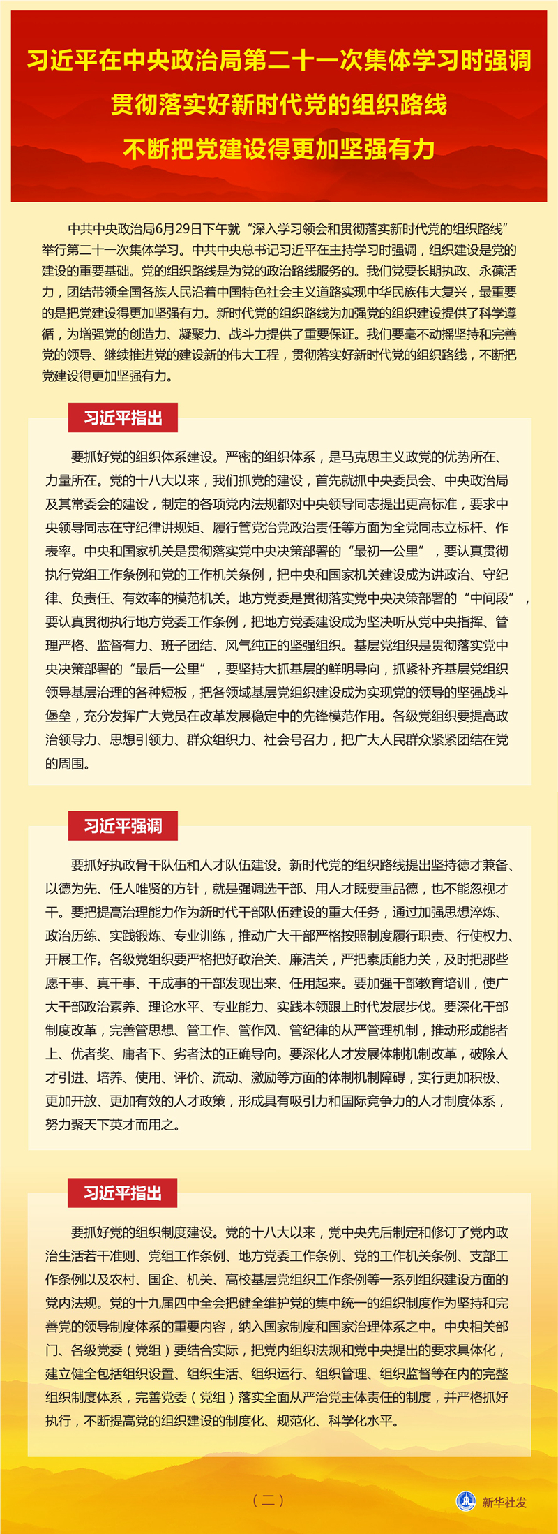 新華社北京6月30日電 中共中央政治局6月29日下午就“深入學(xué)習(xí)領(lǐng)會(huì)和貫徹落實(shí)新時(shí)代黨的組織路線(xiàn)”舉行第二十一次集體學(xué)習(xí)。中共中央總書(shū)記習(xí)近平在主持學(xué)習(xí)時(shí)強(qiáng)調(diào),組織建設(shè)是黨的建設(shè)的重要基礎(chǔ)。黨的組織路線(xiàn)是為黨的政治路線(xiàn)服務(wù)的。我們黨要長(zhǎng)期執(zhí)政、永葆活力,團(tuán)結(jié)帶領(lǐng)全國(guó)各族人民沿著中國(guó)特色社會(huì)主義道路實(shí)現(xiàn)中華民族偉大復(fù)興,最重要的是把黨建設(shè)得更加堅(jiān)強(qiáng)有力。新時(shí)代黨的組織路線(xiàn)為加強(qiáng)黨的組織建設(shè)提供了科學(xué)遵循,為增強(qiáng)黨的創(chuàng)造力、凝聚力、戰(zhàn)斗力提供了重要保證。我們要毫不動(dòng)搖堅(jiān)持和完善黨的領(lǐng)導(dǎo)、繼續(xù)推進(jìn)黨的建設(shè)新的偉大工程,貫徹落實(shí)好新時(shí)代黨的組織路線(xiàn),不斷把黨建設(shè)得更加堅(jiān)強(qiáng)有力。