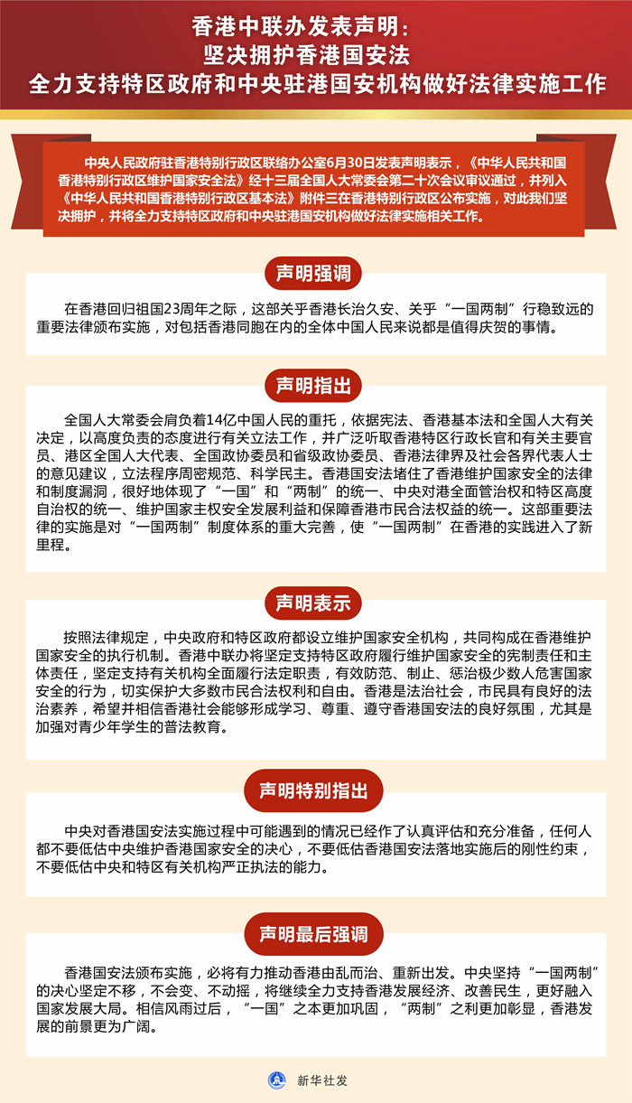 新華社香港6月30日電? 中央人民政府駐香港特別行政區(qū)聯(lián)絡(luò)辦公室30日發(fā)表聲明表示,《中華人民共和國(guó)香港特別行政區(qū)維護(hù)國(guó)家安全法》經(jīng)十三屆全國(guó)人大常委會(huì)第二十次會(huì)議審議通過(guò),并列入《中華人民共和國(guó)香港特別行政區(qū)基本法》附件三在香港特別行政區(qū)公布實(shí)施,對(duì)此我們堅(jiān)決擁護(hù),并將全力支持特區(qū)政府和中央駐港國(guó)安機(jī)構(gòu)做好法律實(shí)施相關(guān)工作。