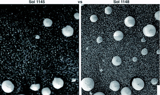 在巖層頂部的這些“生命”是集體定向的,帽子和莖向上傾斜,像沖著某個光源進行光合作用。此外,“機遇號”還拍到了在無風情況下,12個球形“生命”冒出土壤,另外11個“生命”在三天內明顯長大的照片。