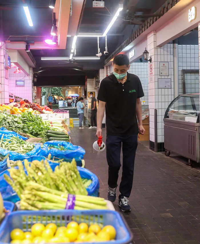 6月16日,在上海市一家菜場內,工作人員在進行消毒工作 丁汀 攝