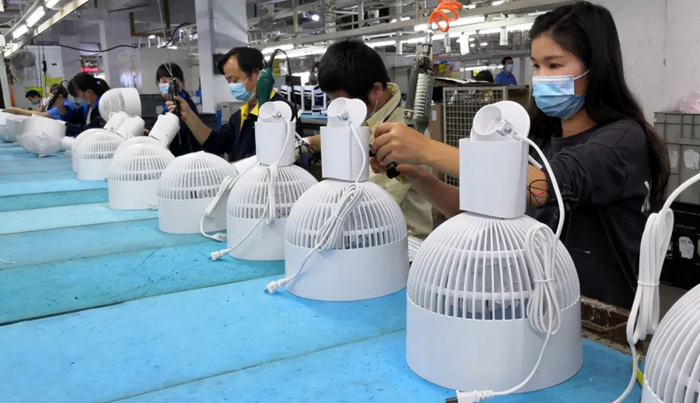 3月2日,深圳市一家企業復工后,工人在生產車間加工電風扇零部件 周科 攝