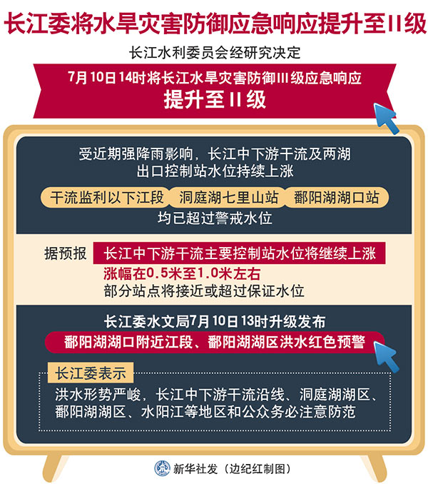 新華社武漢7月10日電(記者李思遠(yuǎn)、樂(lè)文婉)鑒于當(dāng)前長(zhǎng)江流域洪水防御的嚴(yán)峻形勢(shì),長(zhǎng)江水利委員會(huì)經(jīng)研究決定,10日14時(shí)將長(zhǎng)江水旱災(zāi)害防御Ⅲ級(jí)應(yīng)急響應(yīng)提升至Ⅱ級(jí)。