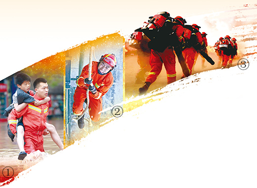 圖①:今年6月底,受暴雨影響,重慶市龍?zhí)逗友鼐€地區(qū)被淹。圖為消防隊(duì)員踏水背出受困群眾。肖樂(lè)峰攝(人民視覺(jué)) 圖②:在山東省煙臺(tái)市消防救援支隊(duì)培訓(xùn)基地,消防隊(duì)員正在參加繩索攀爬比賽。孫文潭攝(人民視覺(jué)) 圖③:今年5月,甘肅省森林消防總隊(duì)張掖支隊(duì)開(kāi)展了實(shí)戰(zhàn)滅火演練。圖為消防隊(duì)員奔赴演練火場(chǎng)。張小軍攝(人民視覺(jué))