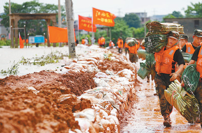 11日,武警戰士在江西鄱陽縣鄱陽鎮江家嶺村搬運抗洪物資。新華社記者 周 密攝