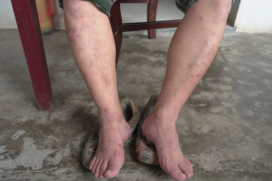 ↑14日,陳壽春的腳已經(jīng)基本恢復(fù),腿上傷疤依舊明顯。(新華社記者 屈彥攝)
