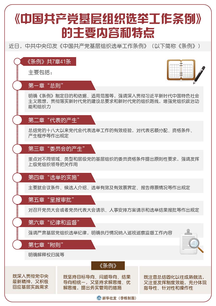 答:《條例》共7章41條,主要包括:第一章“總則”,明確《條例》制定目的和依據(jù)、適用范圍等,強調深入貫徹習近平新時代中國特色社會主義思想,貫徹落實新時代黨的建設總要求和新時代黨的組織路線,增強黨組織政治功能和組織力。第二章“代表的產生”,總結黨的十八大以來黨代會代表選舉工作的有效經驗,對代表名額分配、資格條件、產生程序等作出規(guī)定。第三章“委員會的產生”,重點對不同領域、類型和層級黨的基層組織的委員資格條件提出原則性要求,強調發(fā)揮上級黨組織領導把關作用。第四章“選舉的實施”,主要就會議條件、候選人介紹、選舉有效及有效票界定、報告得票情況等作出規(guī)定。第五章“呈報審批”,對召開黨員大會或者黨員代表大會請示、人事安排方案請示和選舉結果報批等作出規(guī)定。第六章“紀律和監(jiān)督”,強調嚴肅基層黨組織選舉紀律,明確執(zhí)行情況納入巡視巡察監(jiān)督工作內容。第七章“附則”,明確解釋權歸屬等。