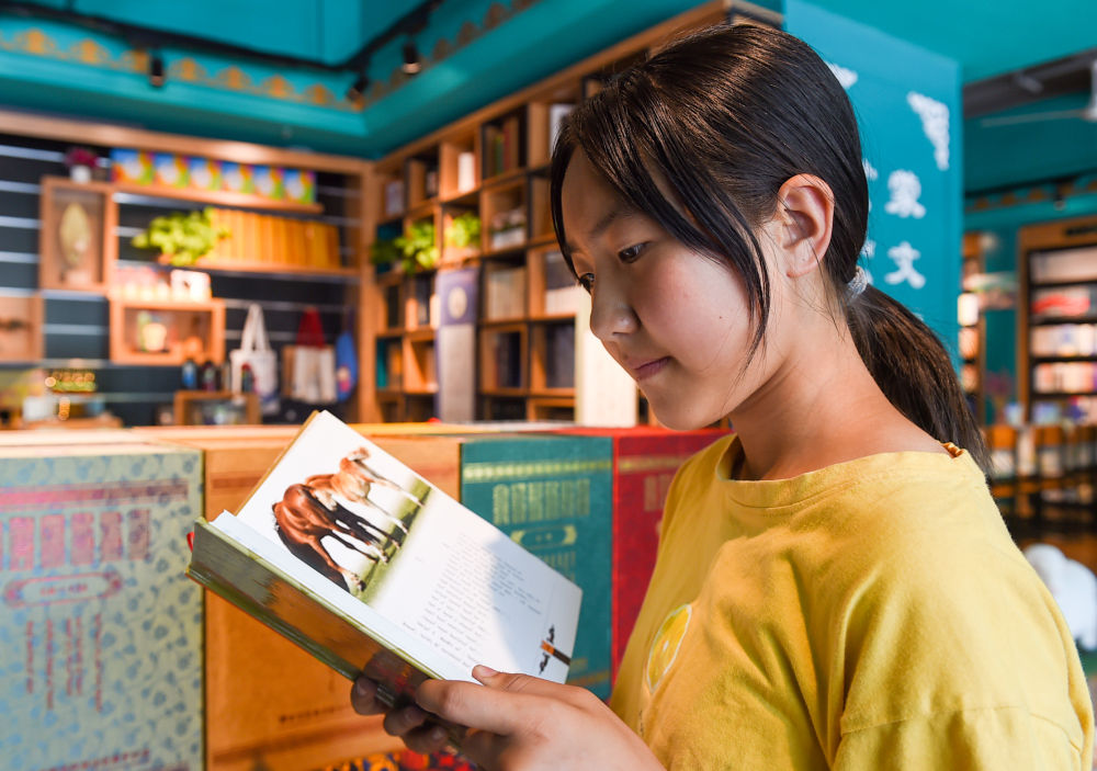 8月4日,錫林花在錫林浩特市的新華書店內(nèi)閱讀與蒙古馬文化有關的書籍。