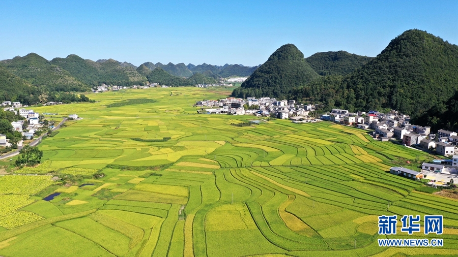 8月26日拍攝的貴州省安龍縣招堤街道海莊村的稻田景色(無人機照片)。 時下,浙江、湖南、貴州等地水稻陸續進入成熟期,豐收在望。 新華社發(劉朝富 攝)